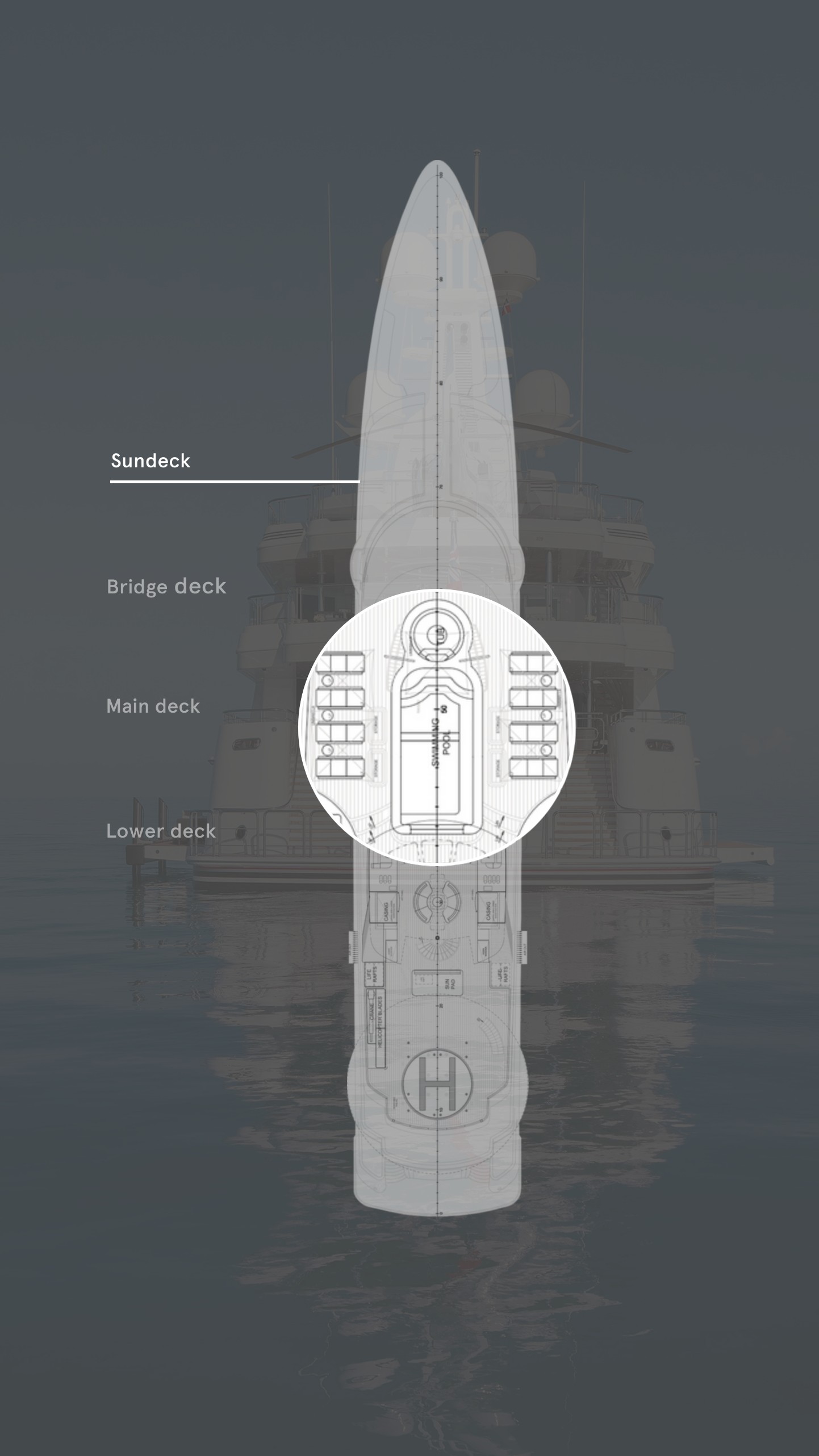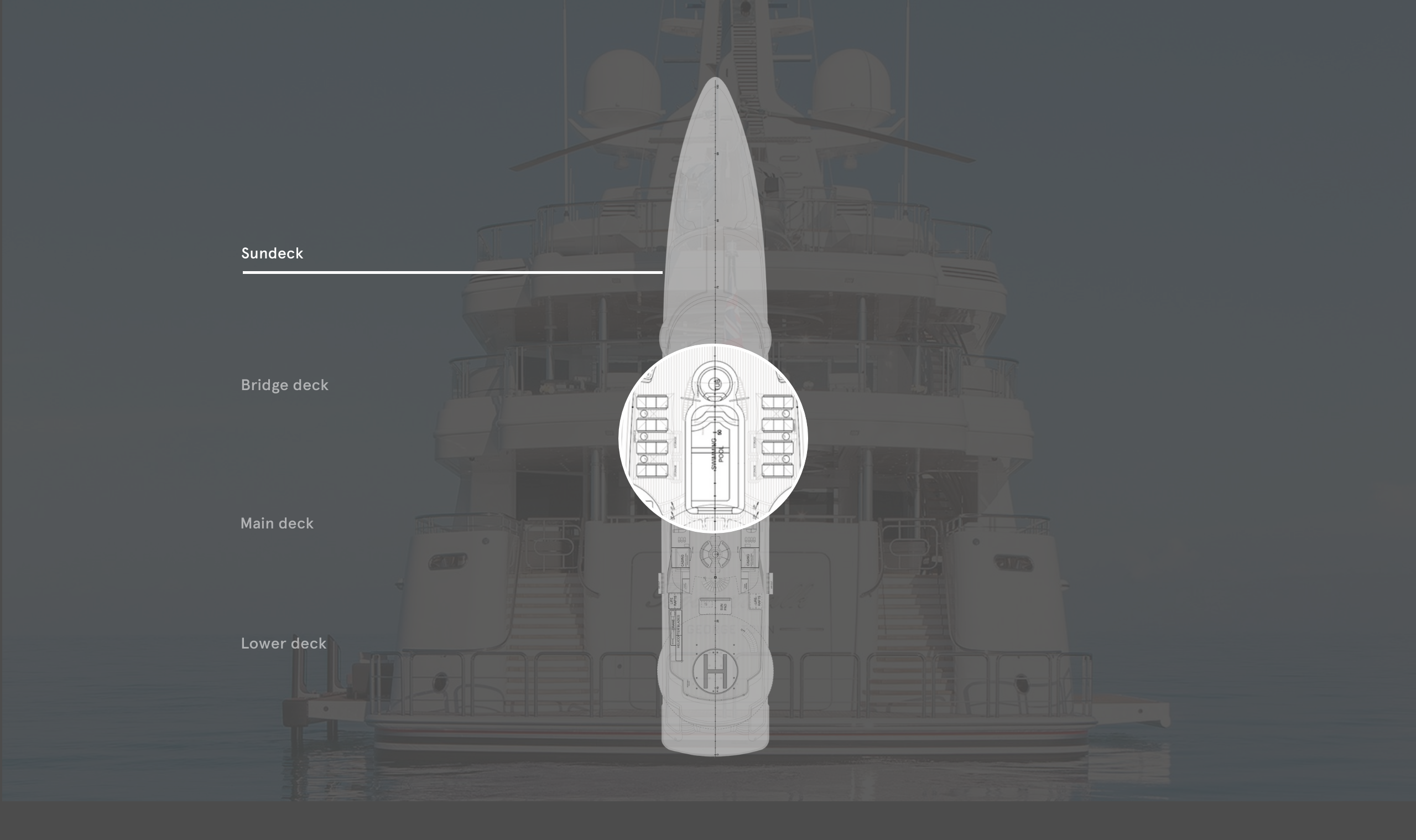 The sundeck (top left) has room for a massive pool forward and a helipad aft. For prime views and privacy, there’s an observation deck one level up (bottom right). Bottom middle: the bridge deck aft is the primary spot for dining outdoors and it includes one of six sit-down bars on board
